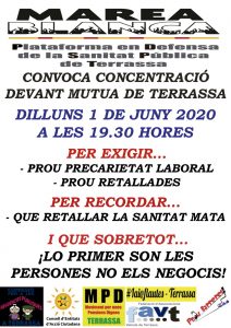 La Plataforma per la Defensa de la Salut Pública a Terrassa (PDSPT) ha convocat una concentració per dilluns, 1 de juny, per la defensa d’una sanitat Pública i de qualitat, per exigir el reconeixement de la gran tasca de tots els imprescindibles en aquesta pandèmia, des dels sanitaris als equips de neteja i reivindicar la millora dels seus convenis i qualitat en els seus llocs de treball.